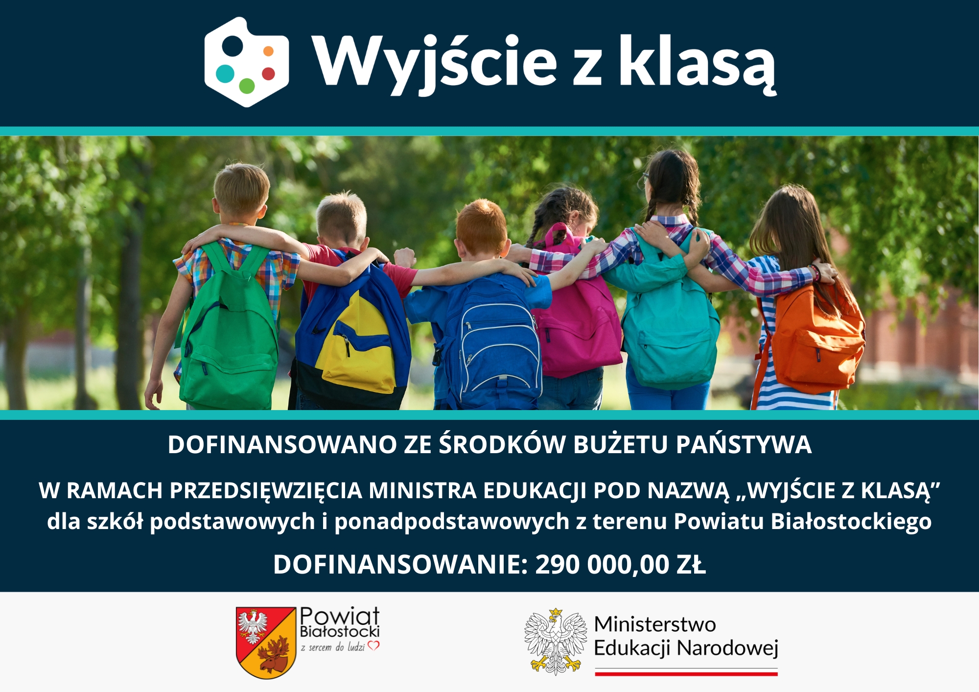W ramach przedsięwzięcia Ministra Edukacji Narodowej pod nazwą „Wyjście z klasą” dla szkół podstawowych i ponadpodstawowych z terenu Powiatu Białostockiego szkoły z terenu Gminy Juchnowiec Kościelny otrzymały dofinasowanie w wysokości 49.145,00 zł.